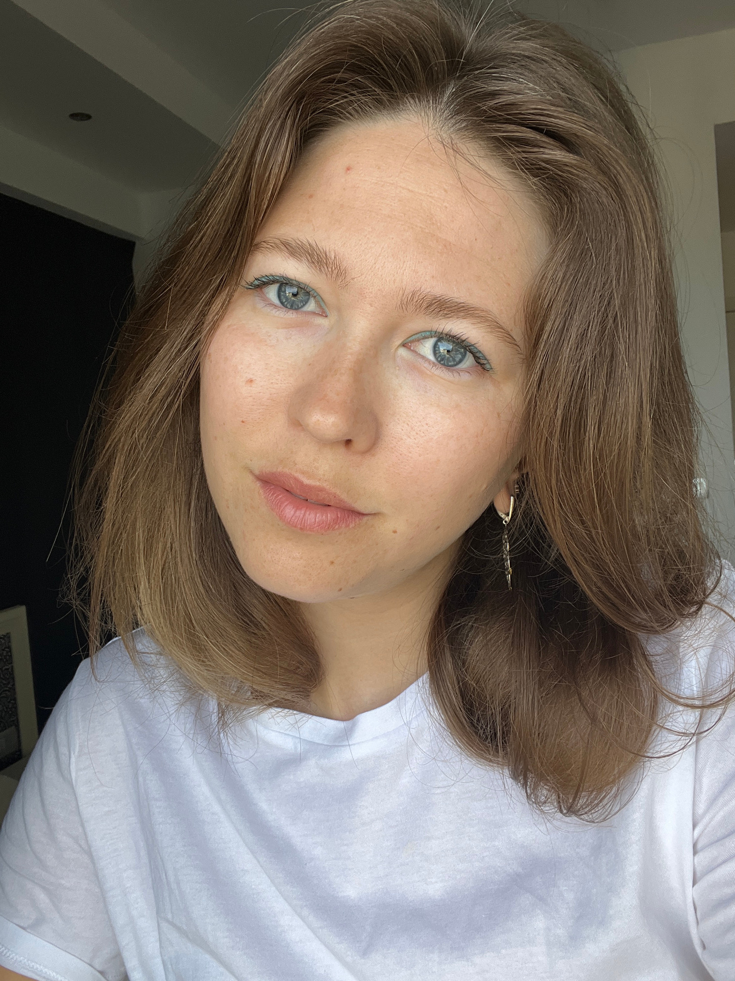 A young woman with light brown hair and blue eyes poses for a close-up shot. She wears a white shirt and a simple gold earring is visible in her right ear. The background is blurred, showing a glimpse…read more