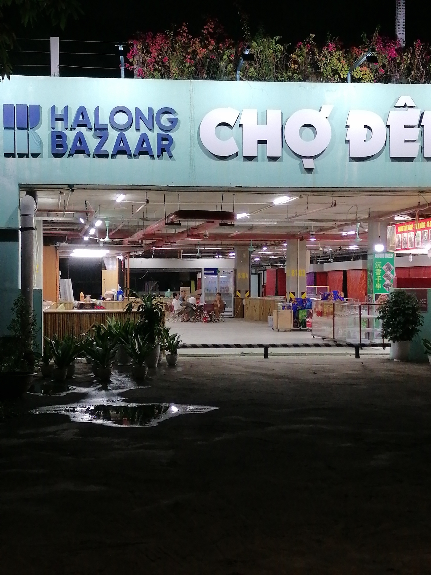 The image depicts the illuminated entrance of the Halong Bazaar and Chợ Đêm (Night Market) at night, located in Bai Chay Ward, Vietnam. The main subjects are the large, prominent signs above the entr…read more