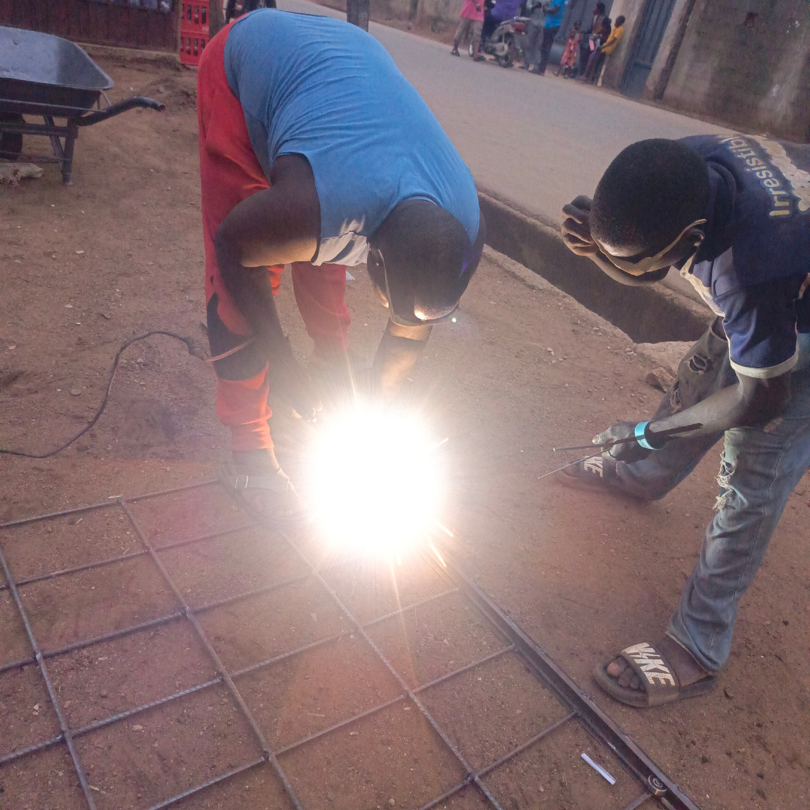 Two men are welding a metal grid on a dirt surface in Akwanga, Nigeria. One man wears orange pants, a blue shirt, and a welding mask. The second man wears ripped jeans, a dark blue shirt, and eye prot…read more
