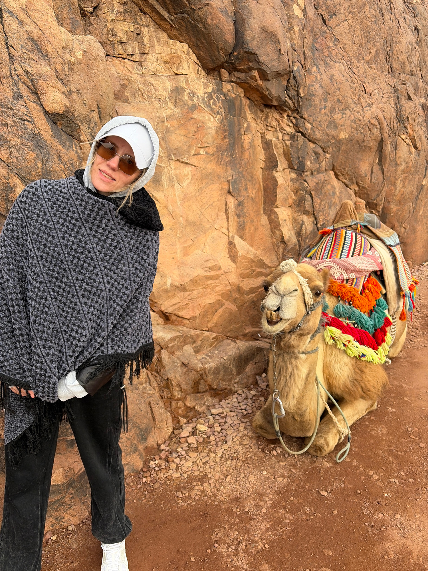 A woman in sunglasses and a hooded sweatshirt, wearing a gray poncho, sits on a rocky slope next to a camel that is lying down. The camel is equipped with a colorful saddle blanket and rope restraints…read more