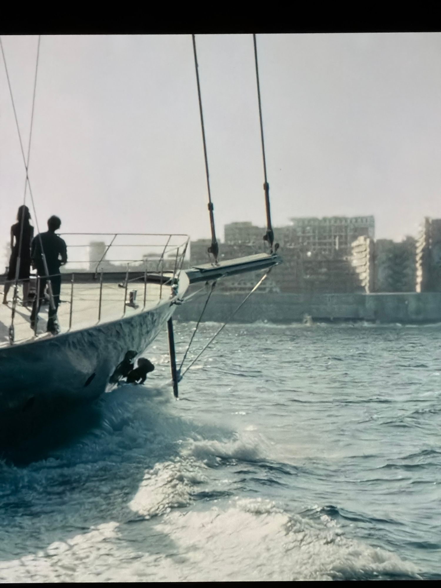 The image shows a submarine moving on the water near the city of London, United Kingdom. Two people are on deck. The buildings of the city are visible in the background. The water is choppy.