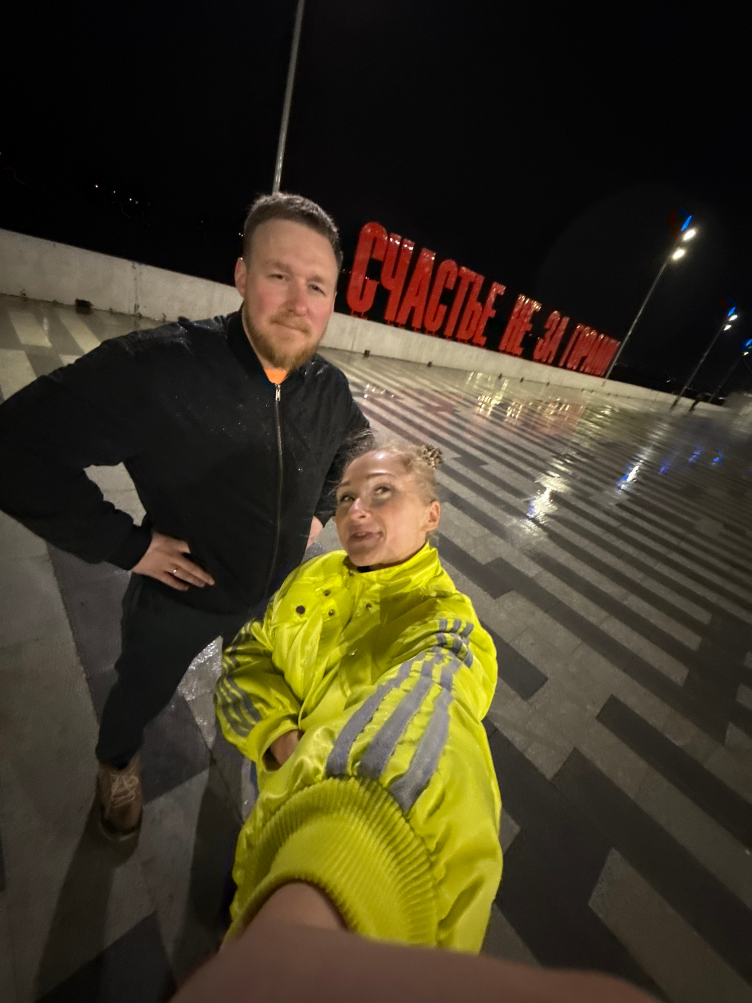 Two individuals pose in the dark, likely at night, in Perm, Russia, near the red illuminated letters spelling out "Счастье не за горами" (Happiness is not far off). A man is dressed in black, and a wo…read more