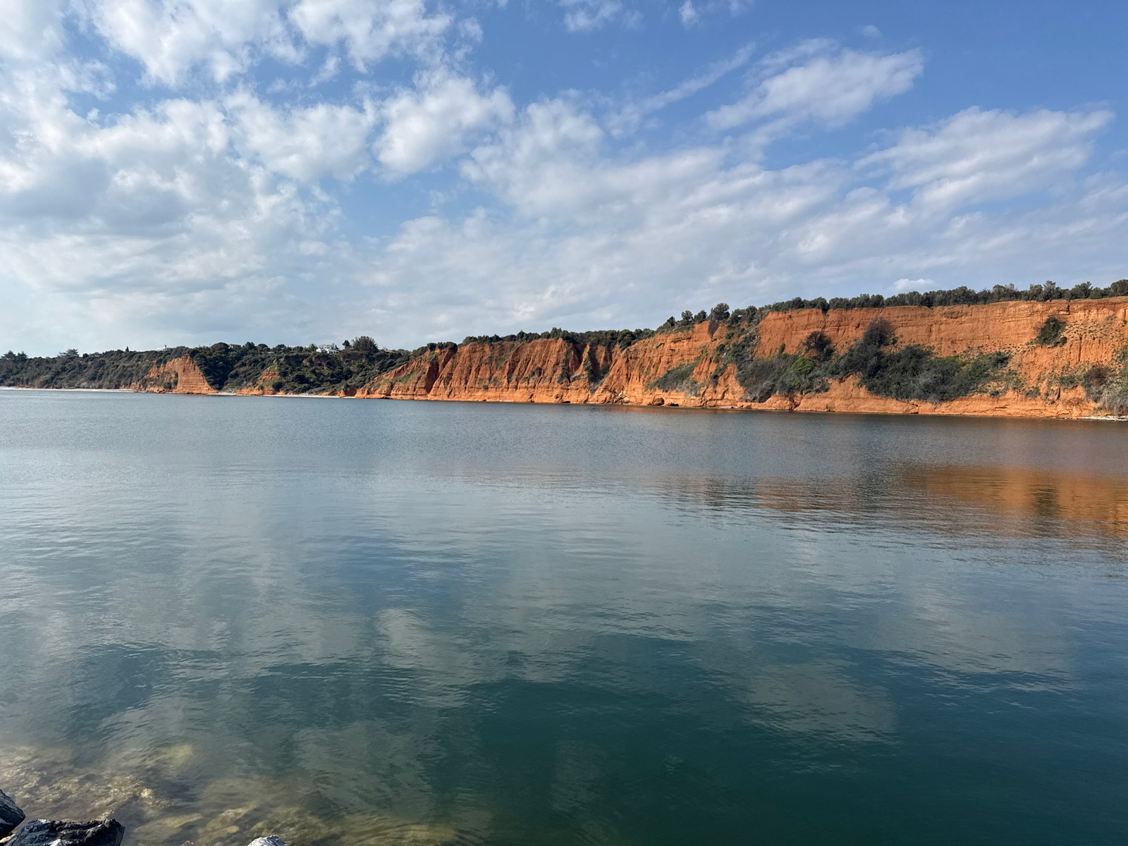 The image depicts a body of water adjacent to a reddish-brown cliff face with sparse vegetation on top, under a sky with scattered clouds. The water surface reflects the sky and clouds. In the lower lā¦read more