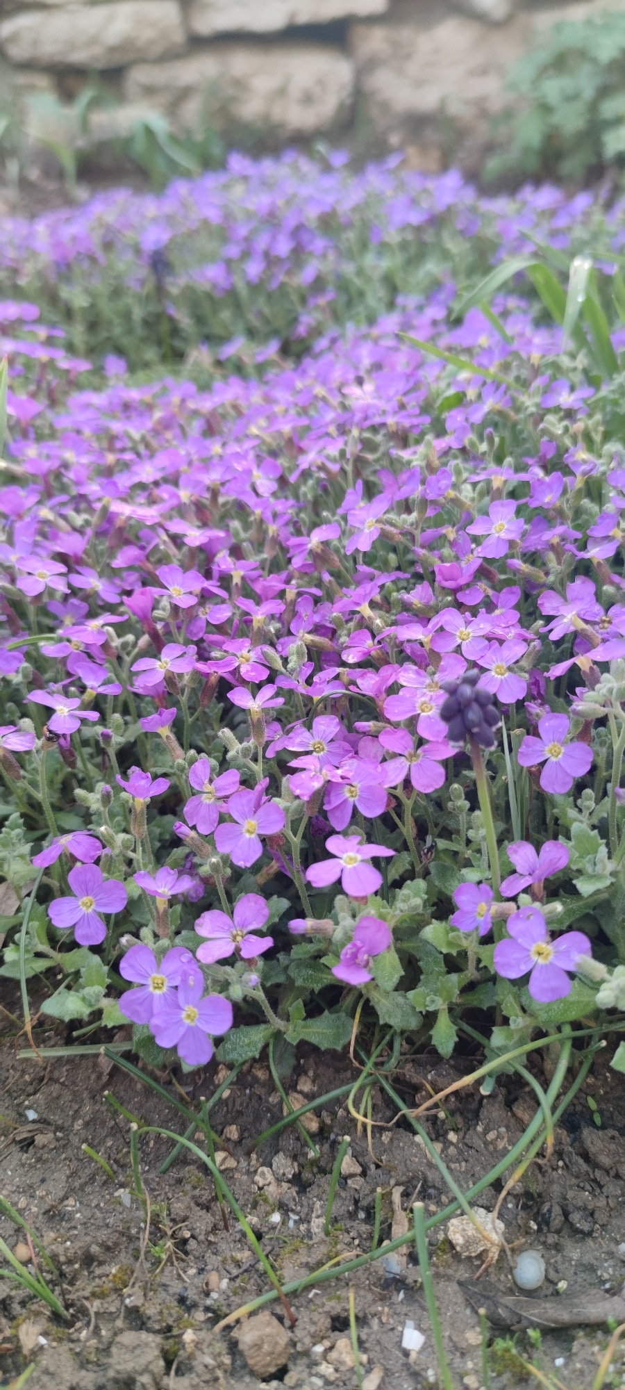 A ground-level shot focuses on a dense carpet of small, purple flowers with yellow centers. The flowers appear to be Aubrieta, a spring-blooming perennial. The foreground reveals dark, slightly damp sā¦read more
