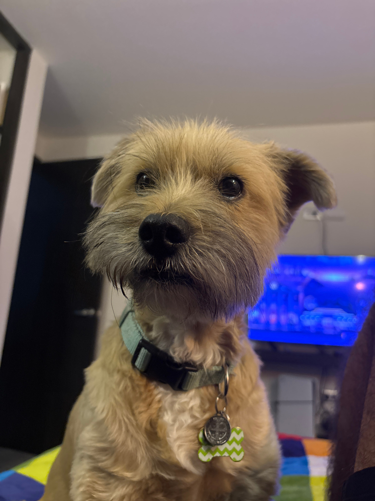 A close-up shot shows a medium-sized, tan-colored, scruffy dog wearing a light blue collar with a black buckle and a bone-shaped tag with a green and white chevron pattern. The dog is looking at the c…read more