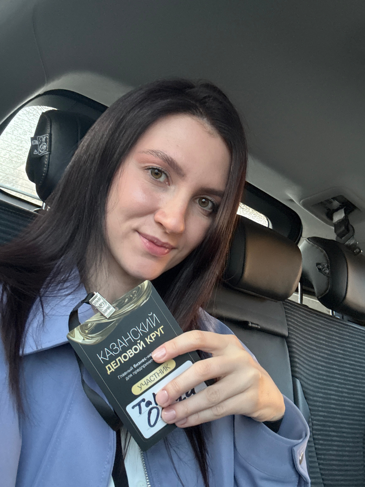 A young woman with long, dark hair and light-colored eyes is featured in a selfie-style photograph, taken inside a car. She is seated in the back, wearing a light blue or lavender-colored jacket, and…read more