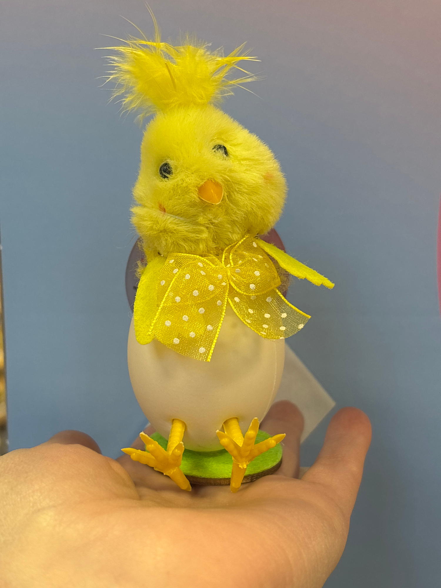 A yellow chick decoration with a dotted ribbon on its head sits atop a white egg-shaped object. The base of the object is green, with yellow chick feet attached. A hand is holding the decoration. The…read more