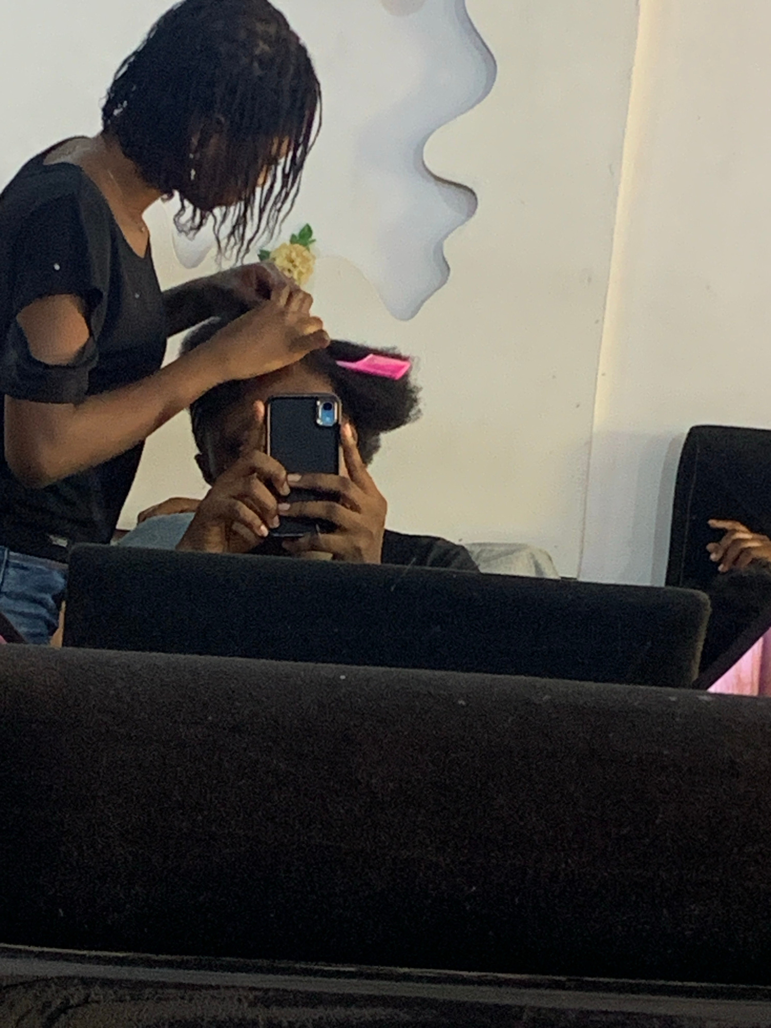 A woman stands in front of a mirror, holding up a cell phone to photograph her reflection in a brightly lit room. The woman has short, dark, curly hair with a pink barrette. She wears a dark-colored,…read more