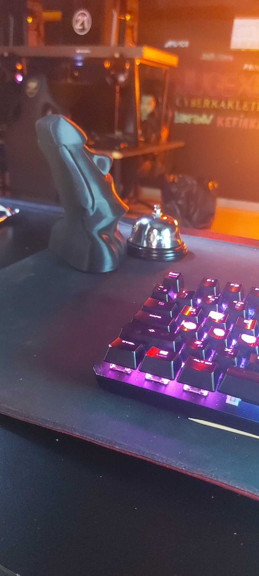 The image shows a silver service bell mounted on a dark-colored base with an adjacent keyboard with lit keys. The background is blurry, with glimpses of a book labeled "CYBERKAKLEITTI" and some other…read more