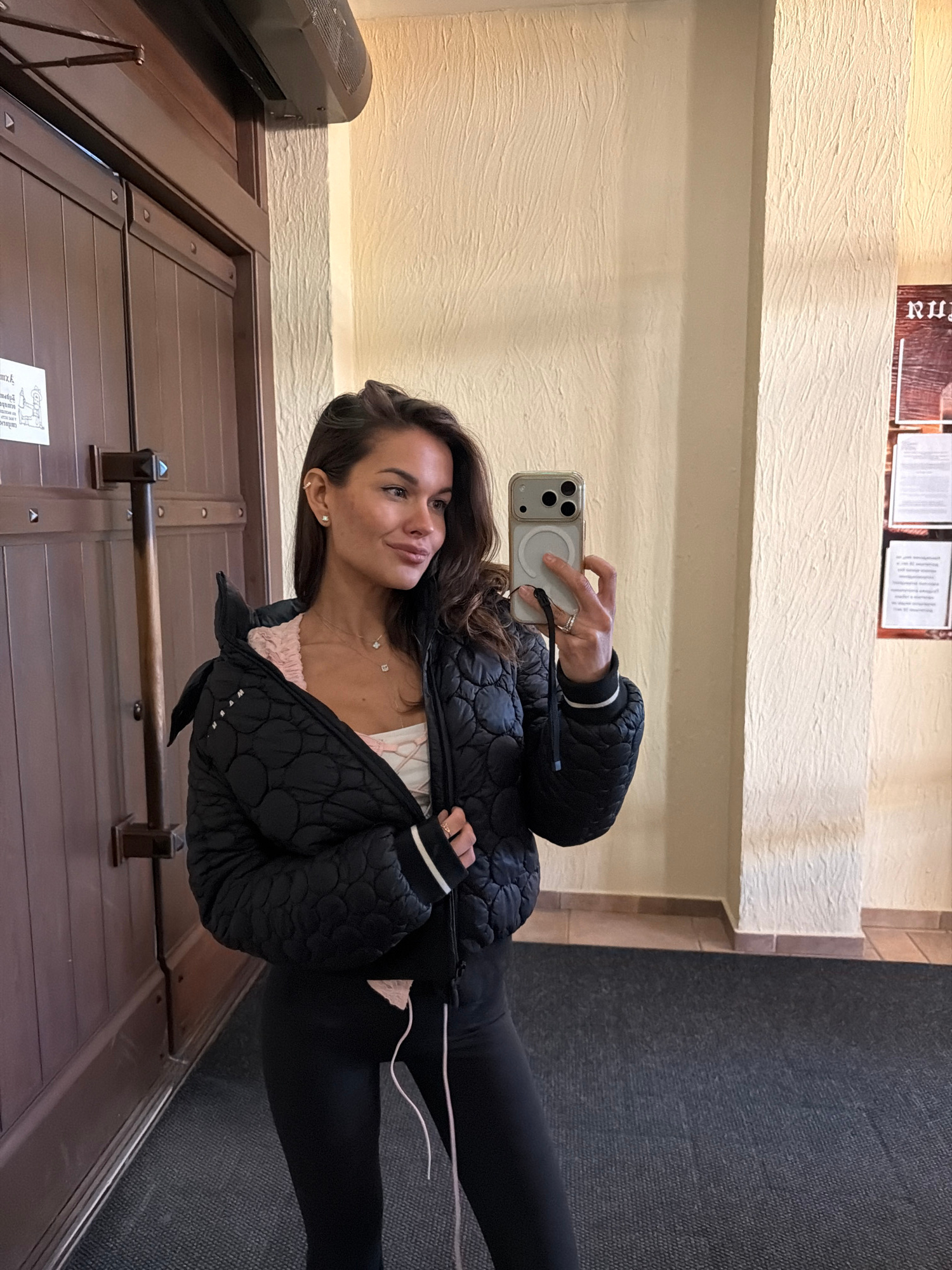 A woman is taking a selfie indoors. She is wearing a black quilted jacket and black leggings. She is holding a smartphone up to her face. The background includes a textured beige wall, a dark wood doo…read more