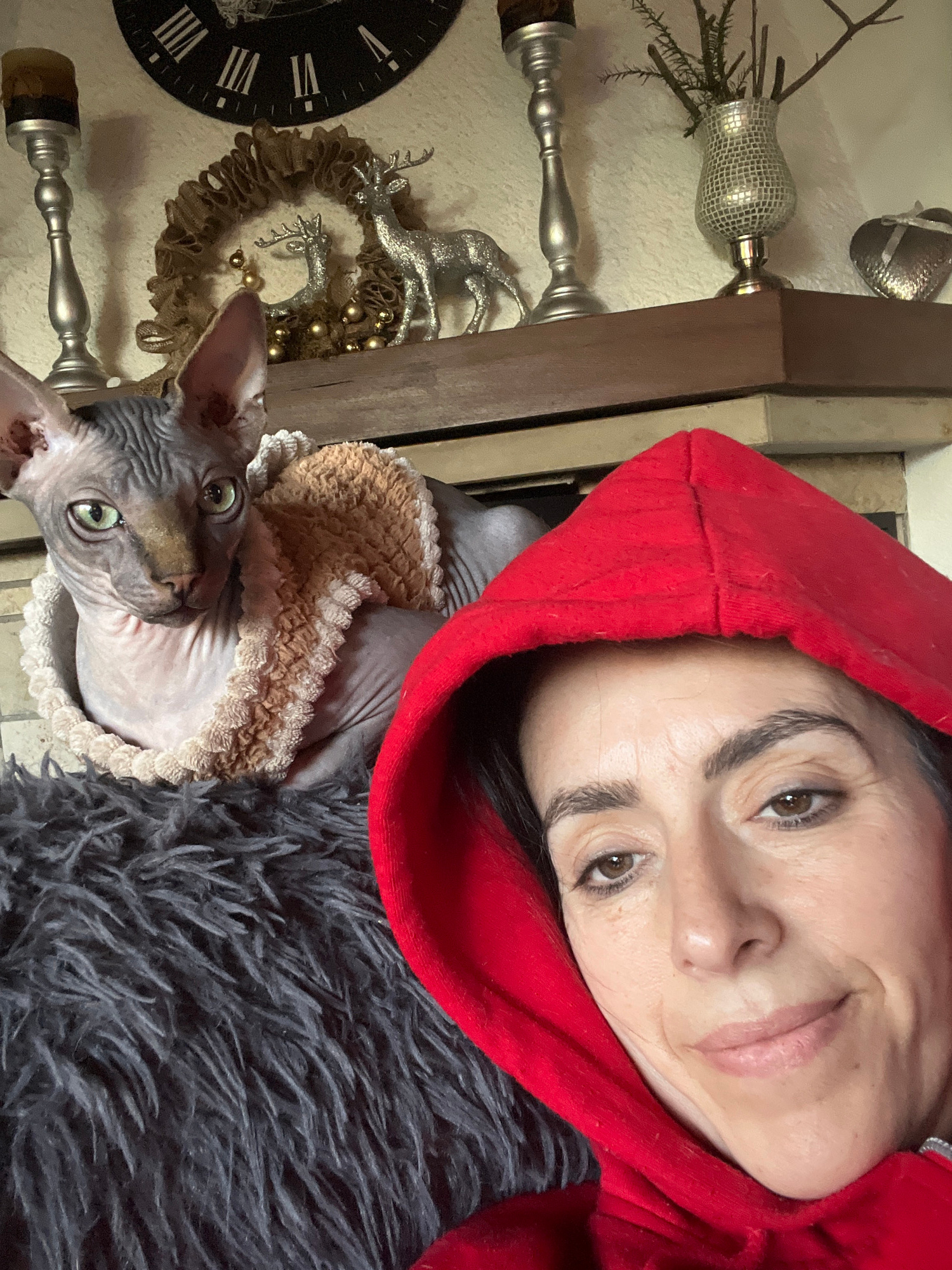 A woman wearing a red hooded sweatshirt poses for a selfie with a Sphynx cat dressed in a decorative beige collar. The cat is positioned to the left of the woman. They are both sitting on a gray fur-l…read more