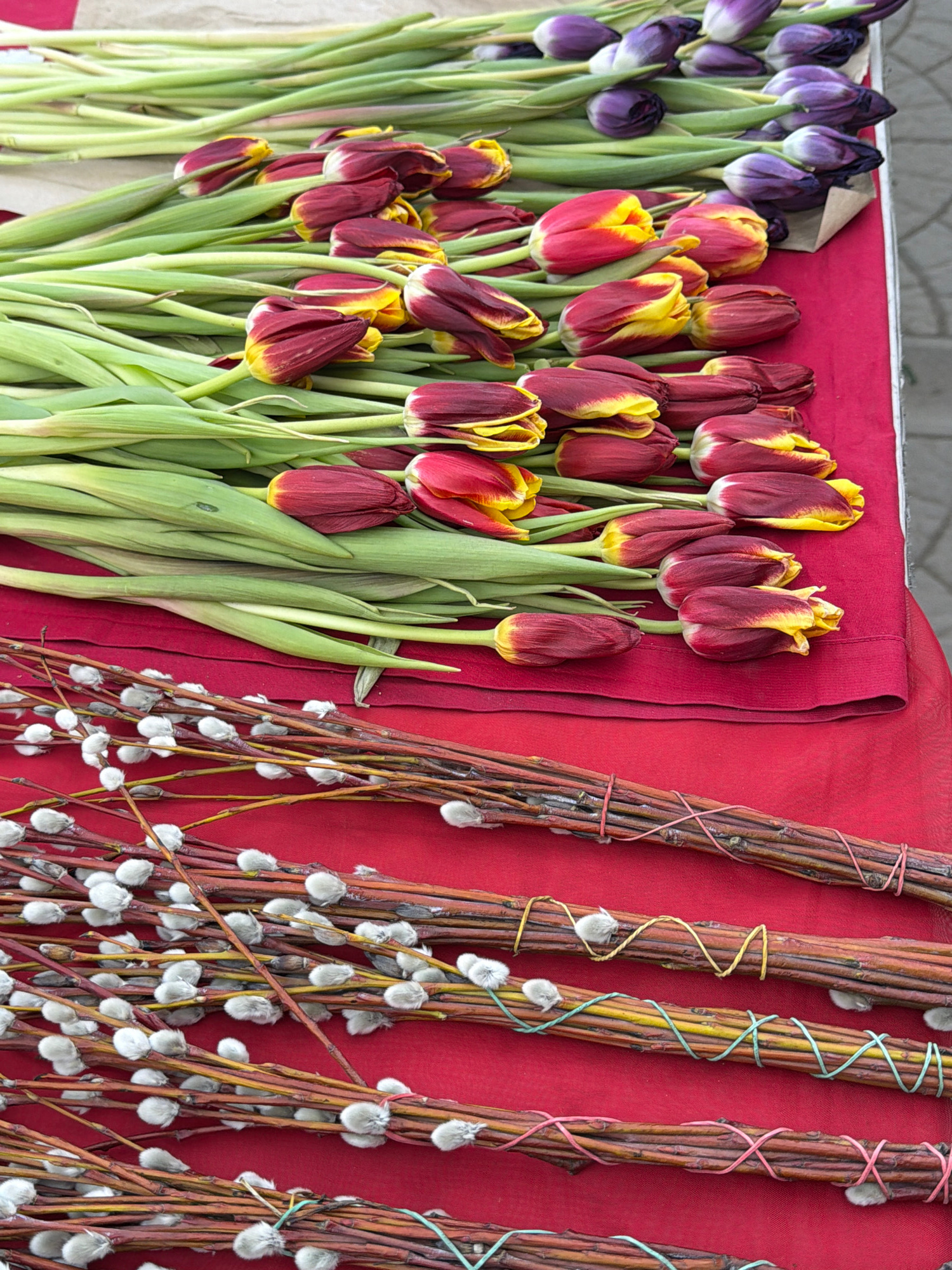 The image shows a display of flower bunches and willow branches, likely for sale. On the left are two bunches of tulips: one with purple petals and one with red and yellow petals. These are placed on…read more