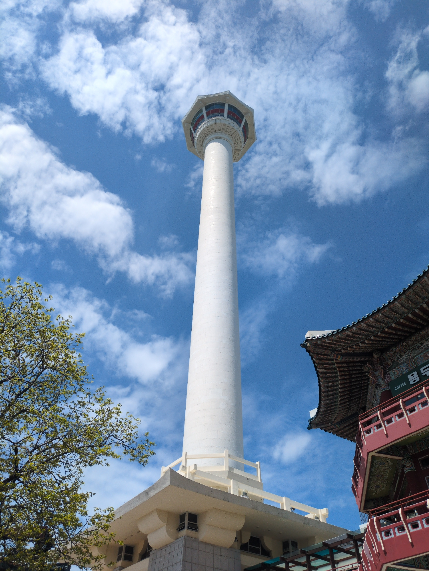 The image presents a low-angle view in Busan, South Korea, capturing the Busan Tower against a partly cloudy sky. The tower, a tall, white cylindrical structure, is the central focus, extending upward…read more