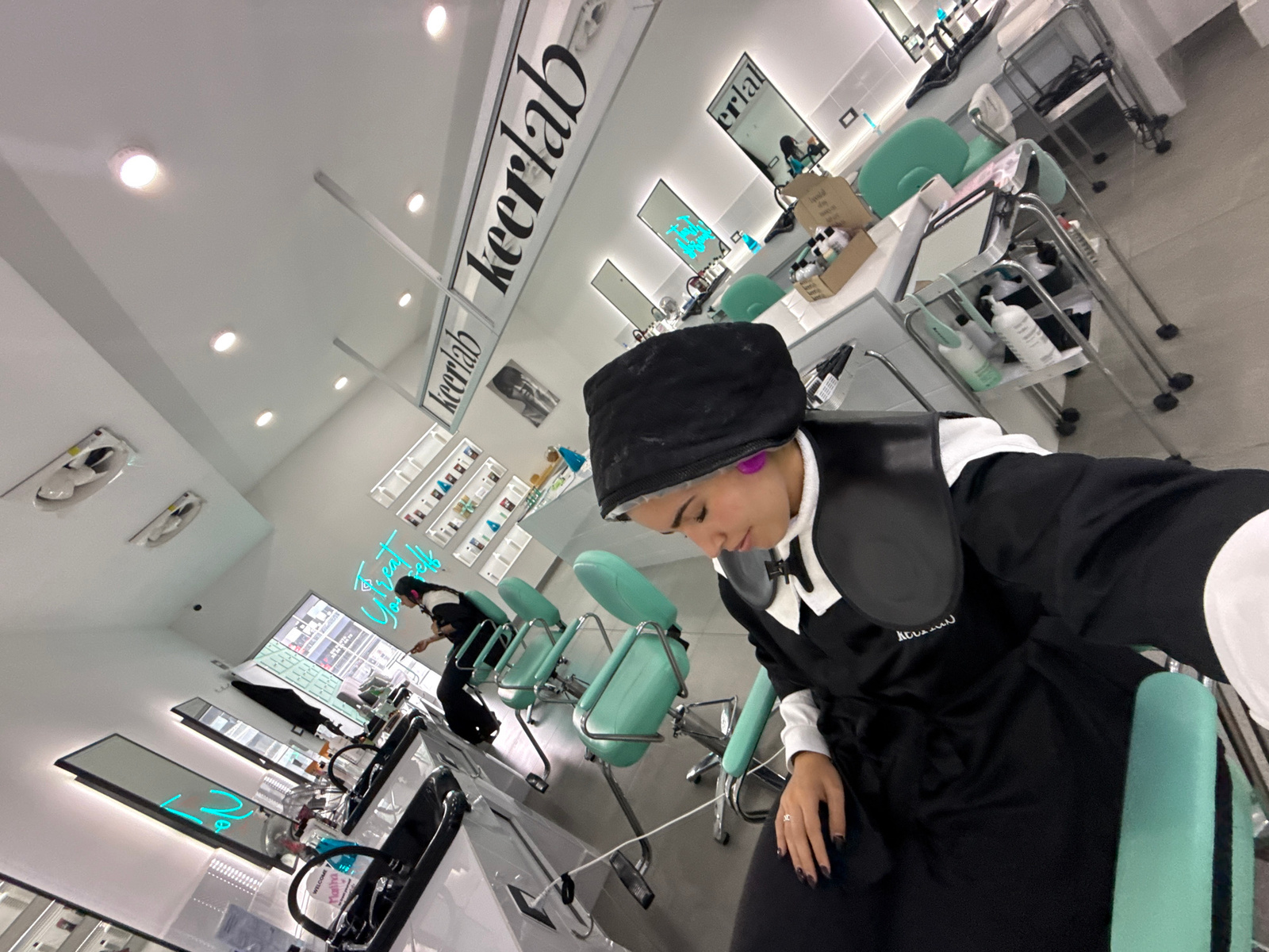Here is a description of the image: The photo captures the interior of a hair salon, likely located in San Bernardino Tlaxcalancingo, Mexico. The dominant feature is a woman in the foreground seated…read more