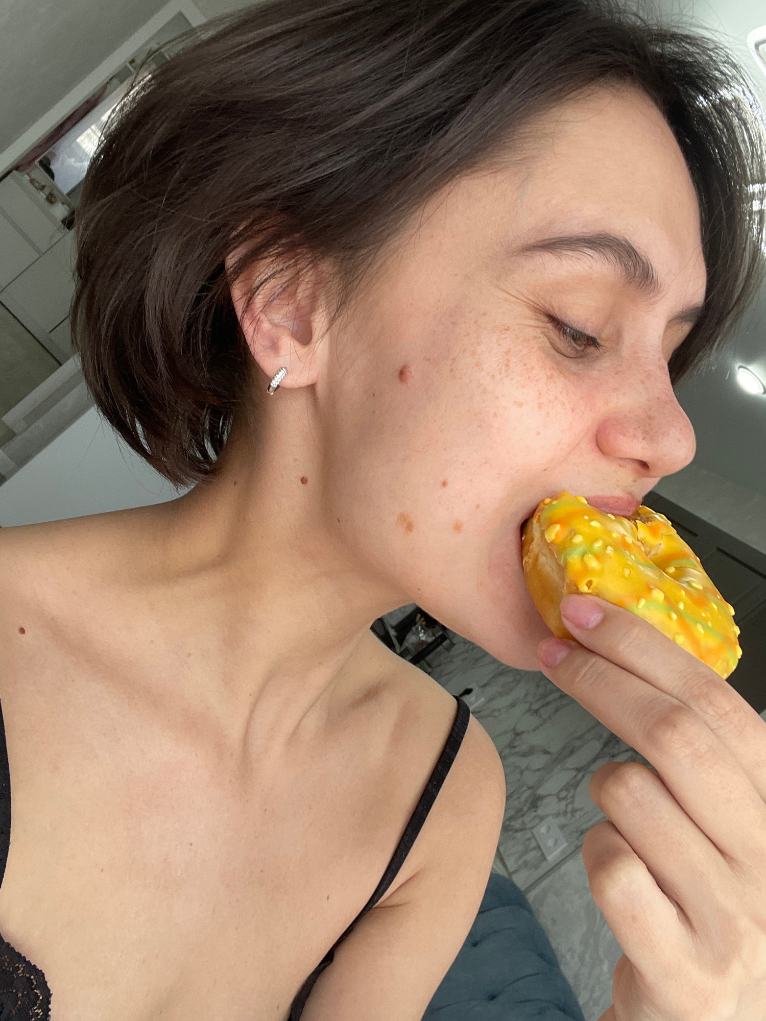 A woman with short brown hair is holding a yellow glazed doughnut to her mouth, biting into it. She has freckles and a mole on her face and a diamond earring in her left ear. She is wearing a black ca…read more