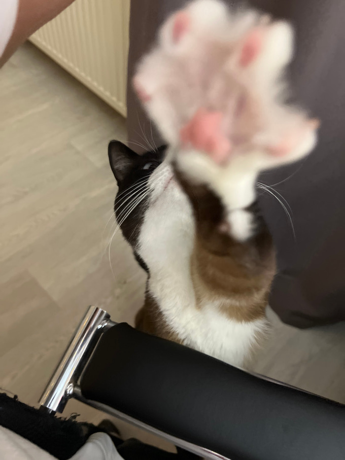 An indoor scene in Noviy, Russia, features a domestic tricolor cat (black, white, and brown/tan markings) extending its front right paw directly towards the viewer. The paw, out of focus, displays whi…read more