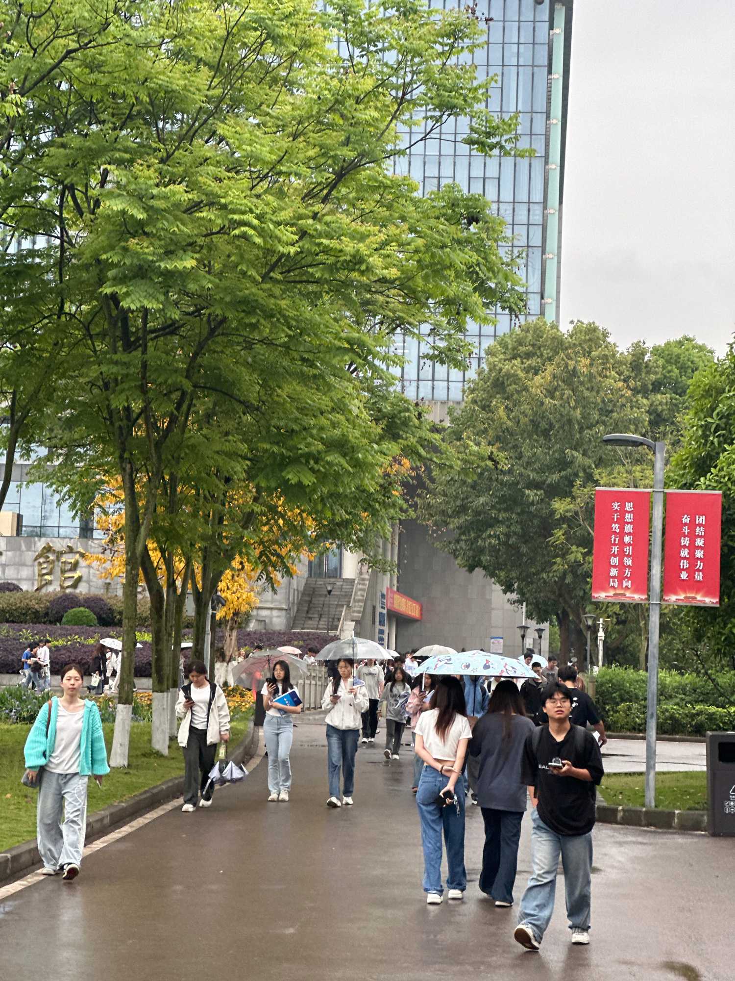 A wide-angle, overcast exterior shot shows a walkway in Jiangjin, China, with a crowd of people, many holding umbrellas, walking on a wet paved path. The path is bordered by a low curb and a strip of…read more