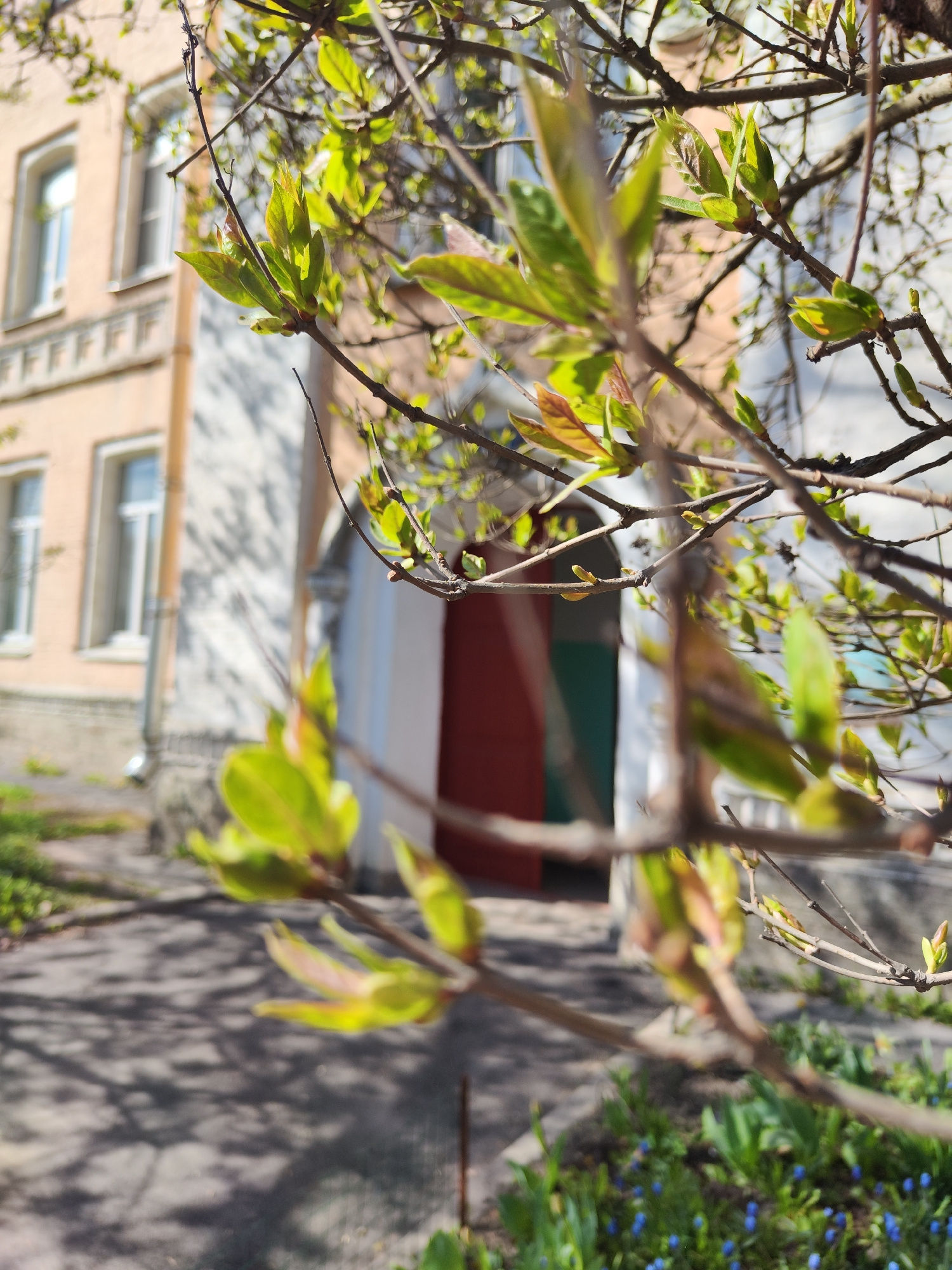 The image presents a close-up, upward-angled view of tree branches adorned with fresh, light green leaves, signaling the arrival of spring. The branches and new foliage are in sharp focus in the foreg…read more