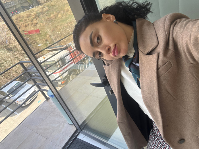 A woman with dark, curly hair pulled back poses for a selfie, looking directly at the camera with a slight smile. She is wearing a light brown double-breasted coat over a white turtleneck sweater and…read more