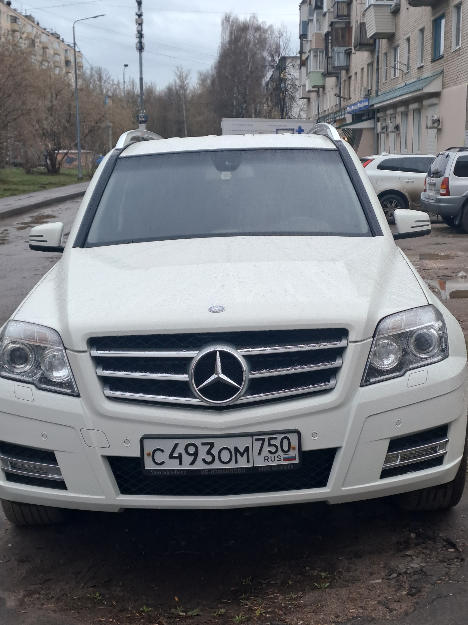 A white Mercedes-Benz SUV is parked outdoors on a street with rain drops visible on its surface. The front of the vehicle is facing the viewer, prominently displaying the grill with the Mercedes-Benz…read more