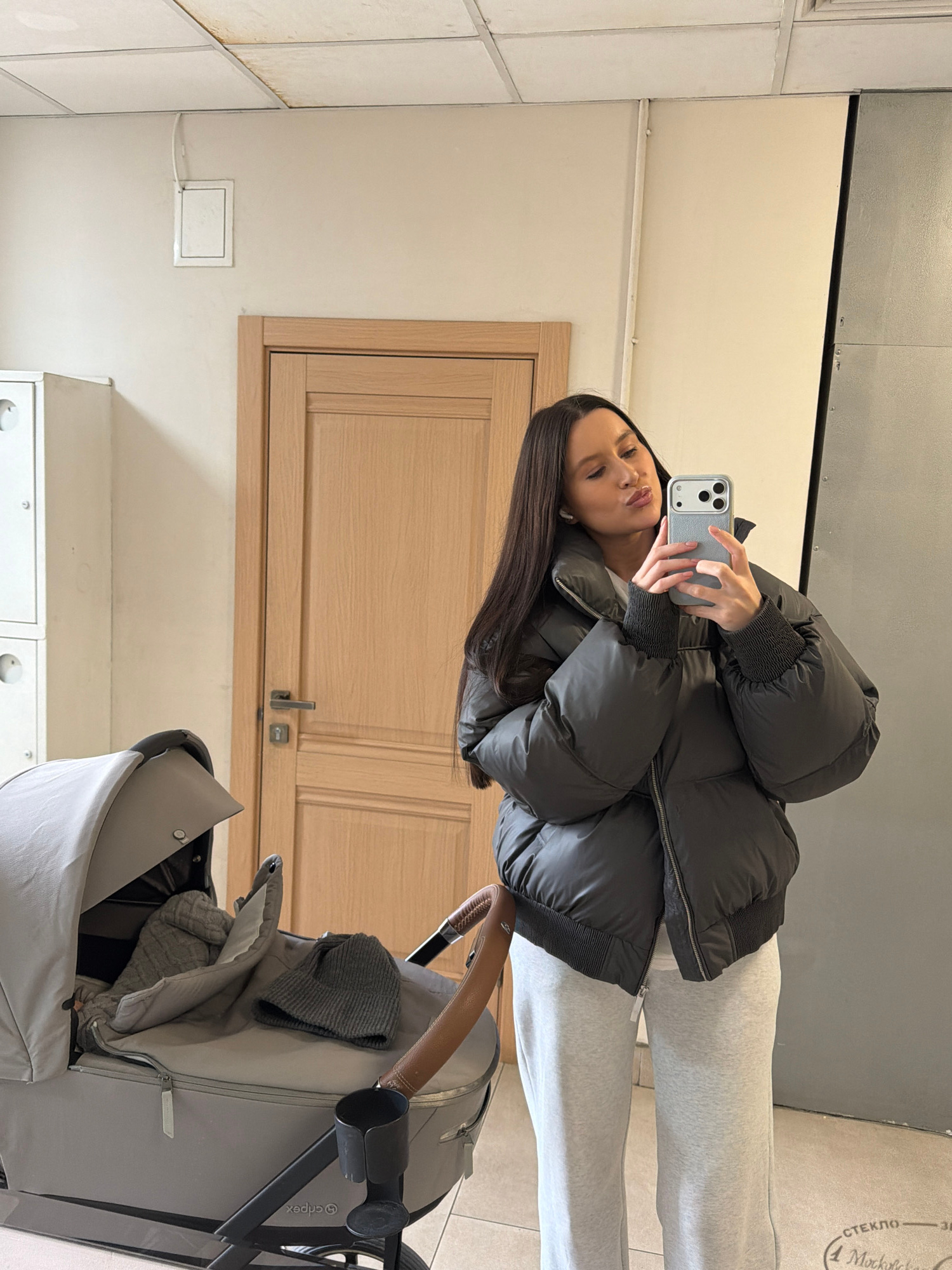 The vertical image, rotated counter-clockwise, depicts a woman taking a mirror selfie indoors. The woman has long dark hair and is wearing a dark grey or black puffer jacket with ribbed cuffs and ligh…read more