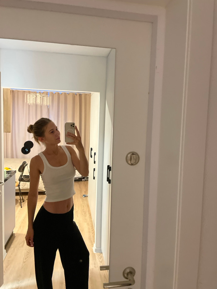 A woman is taking a mirror selfie indoors. She is wearing a white tank top and black leggings. The background shows a room with curtains and light-colored wooden flooring. A desk with a lamp and weigh…read more