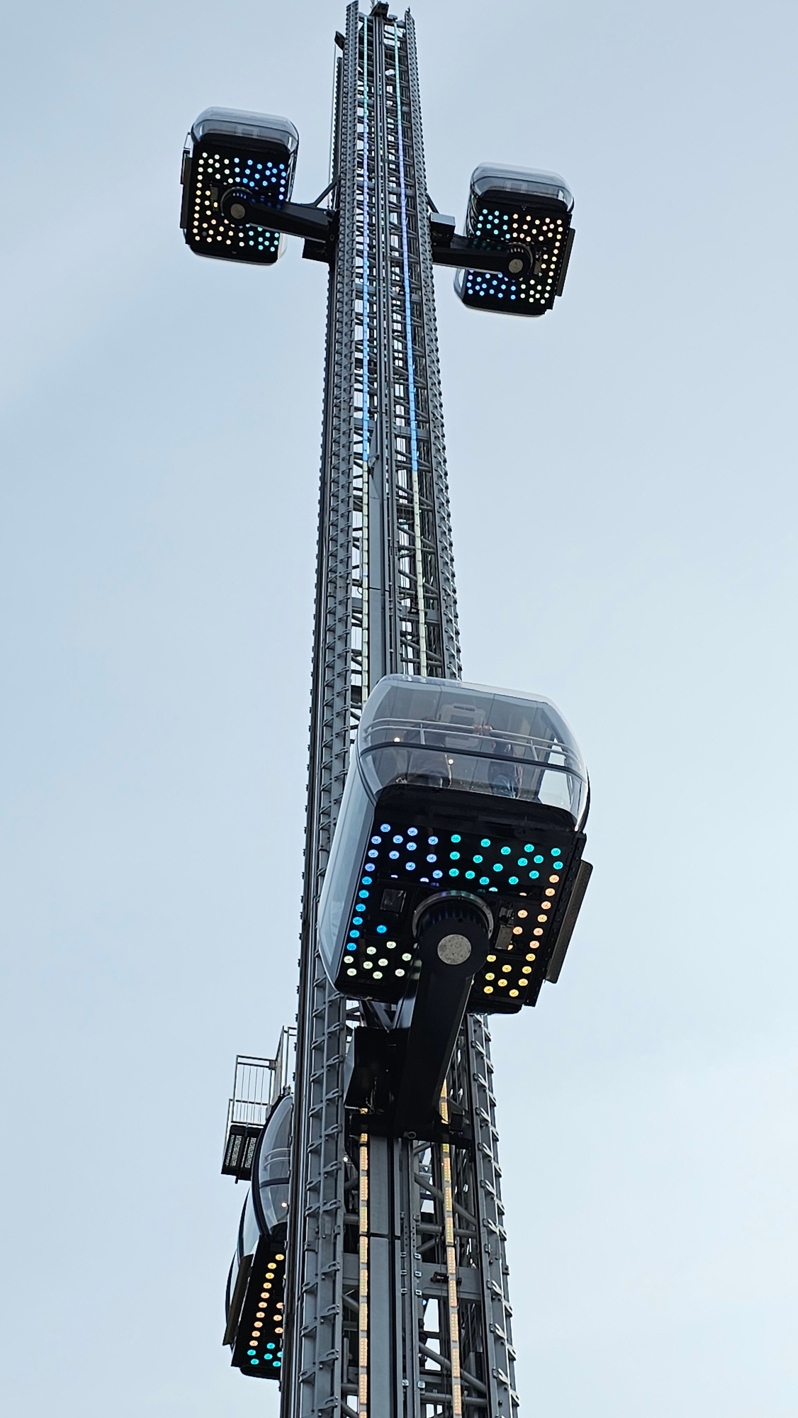 The image displays an upward, partial view of a tall amusement park ride, identified as the Bayern Tower (a Star Flyer attraction), located on the Theresienwiese in Munich, Germany. The ride consists…read more