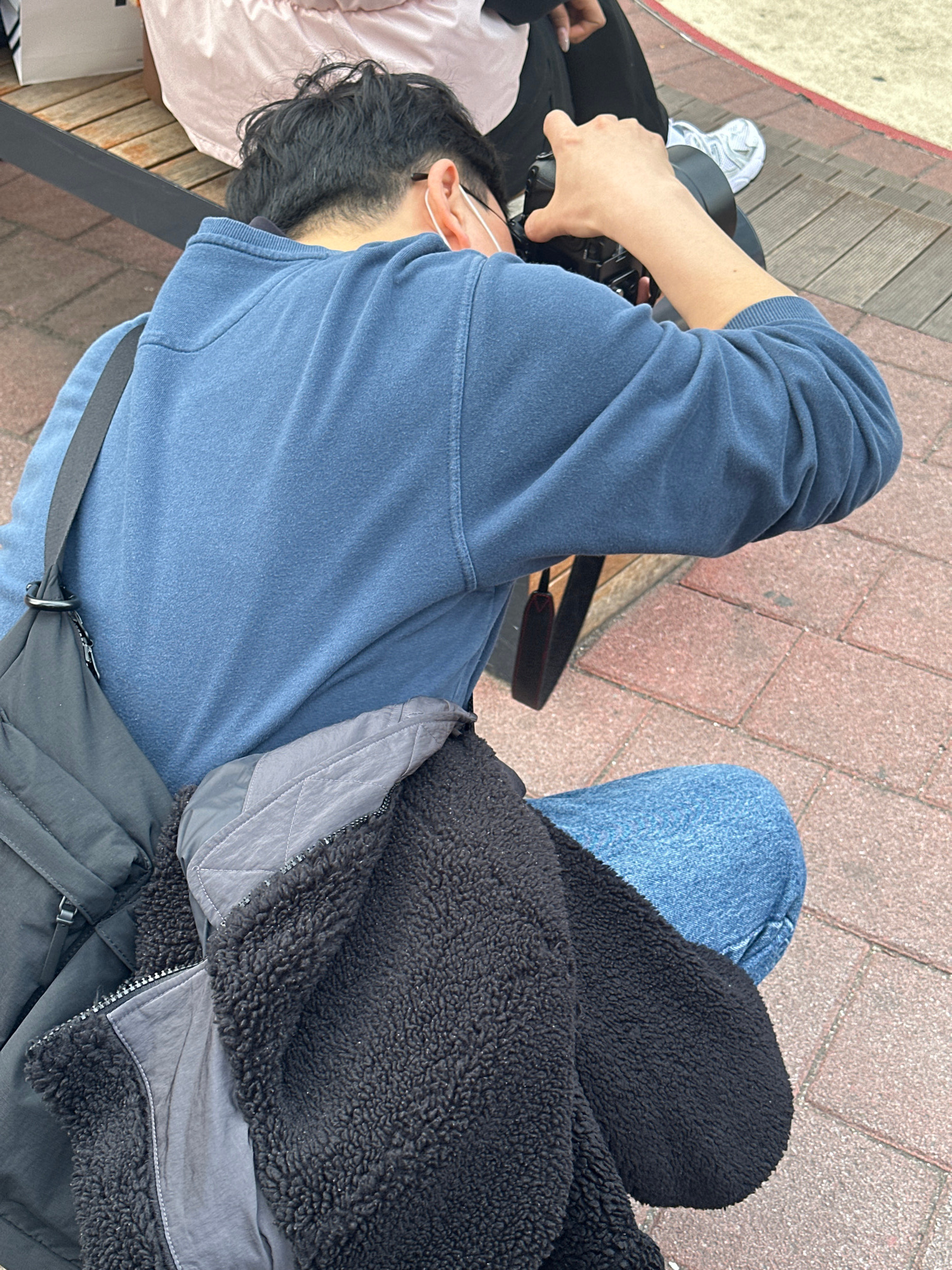 The image captures an outdoor scene in Seoul, South Korea, primarily focusing on a person in a crouched or kneeling position. This individual, seen from behind, has short, dark hair with a visible und…read more