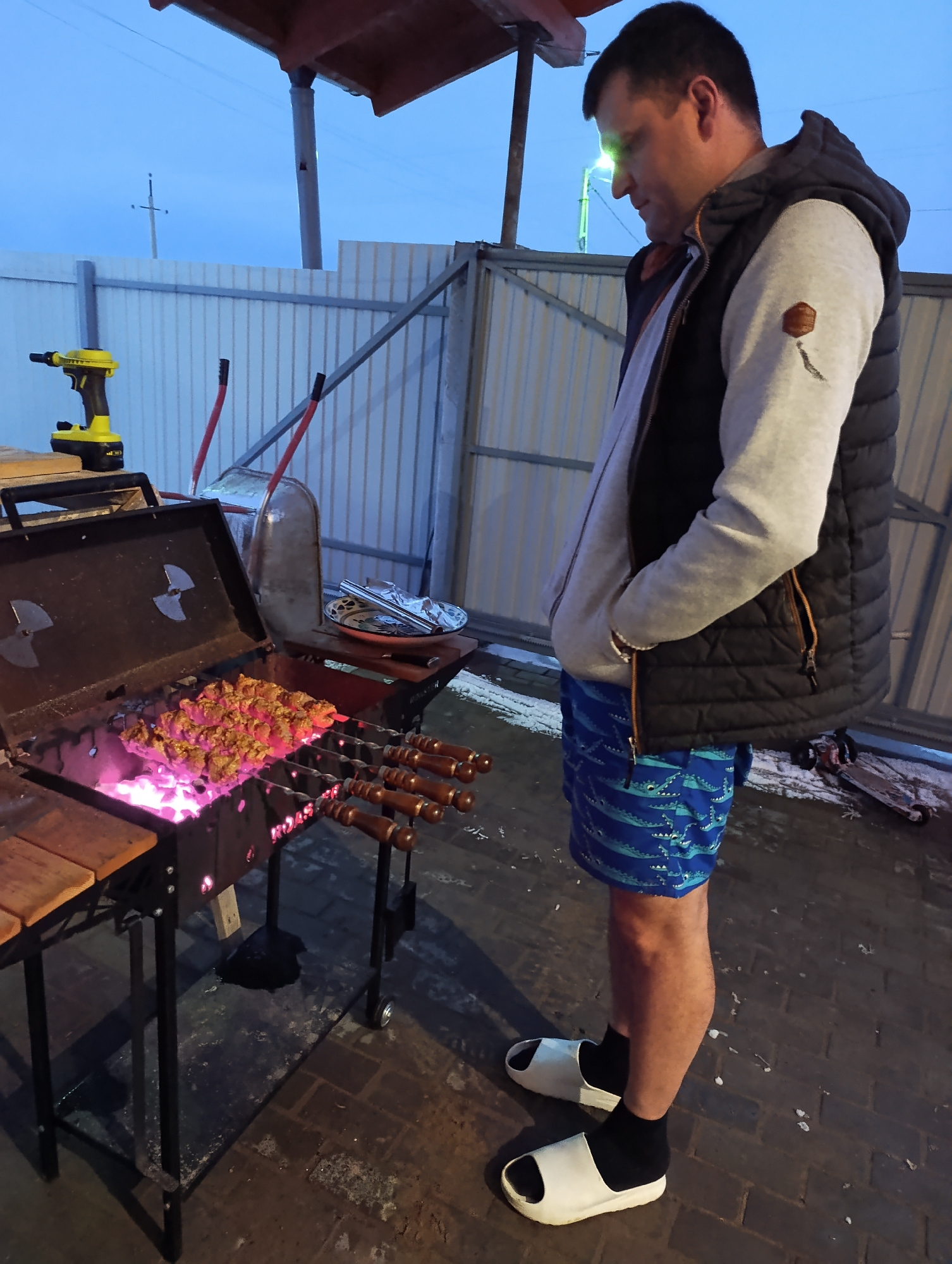 The image depicts a man standing outdoors next to a barbecue grill. He is wearing a gray hooded sweatshirt, a black quilted vest, blue swim trunks with a crocodile pattern, black socks, and white slid…read more