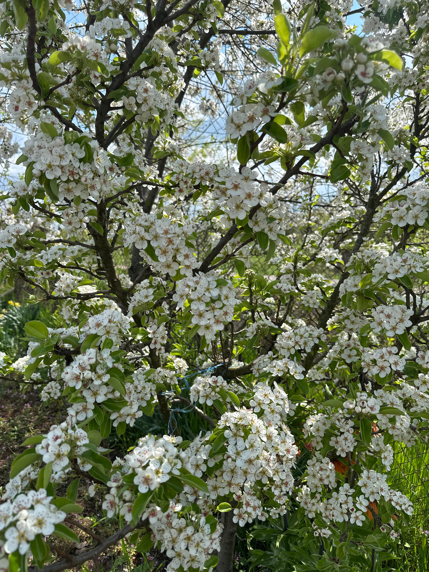 The image shows a tree in full bloom with white flowers. The branches are dark brown, and green leaves are emerging. The sky is visible through the branches in some areas. The location is not identifi…read more