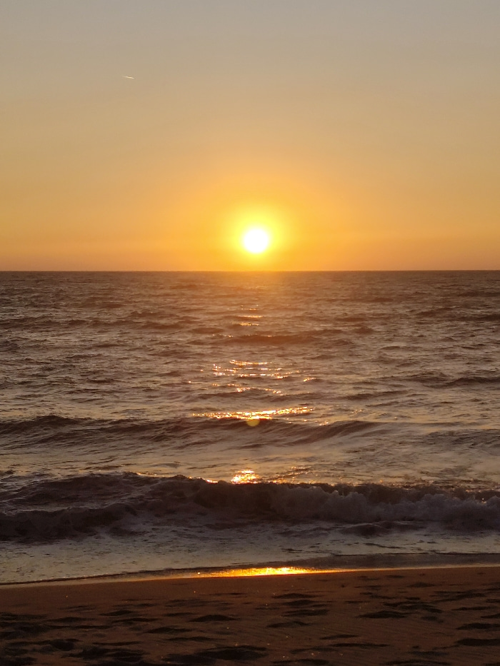 The image depicts a sunset over a body of water, identified as the sea at Querim, India. The sun, a bright yellow-orange orb, is centered in the upper portion of the frame, slightly above the horizon.…read more