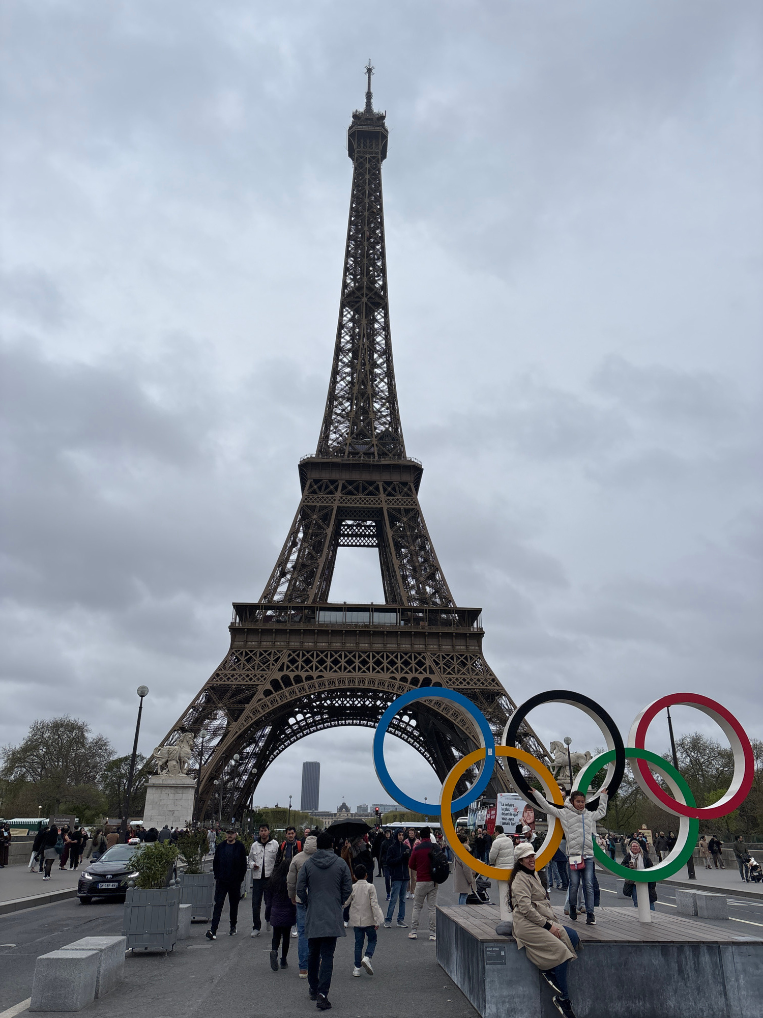 The image captures the Eiffel Tower in Paris, France, positioned under a cloudy sky. Five Olympic rings are prominently displayed near the base of the tower, with people interacting with the display. Several people are standing and seated near the rings, appearing to pose for photos. A group of tourists is visible in the background, observing the scene. There are trees and street furniture along the roadway. Cars are also present on the street. | Open Wire