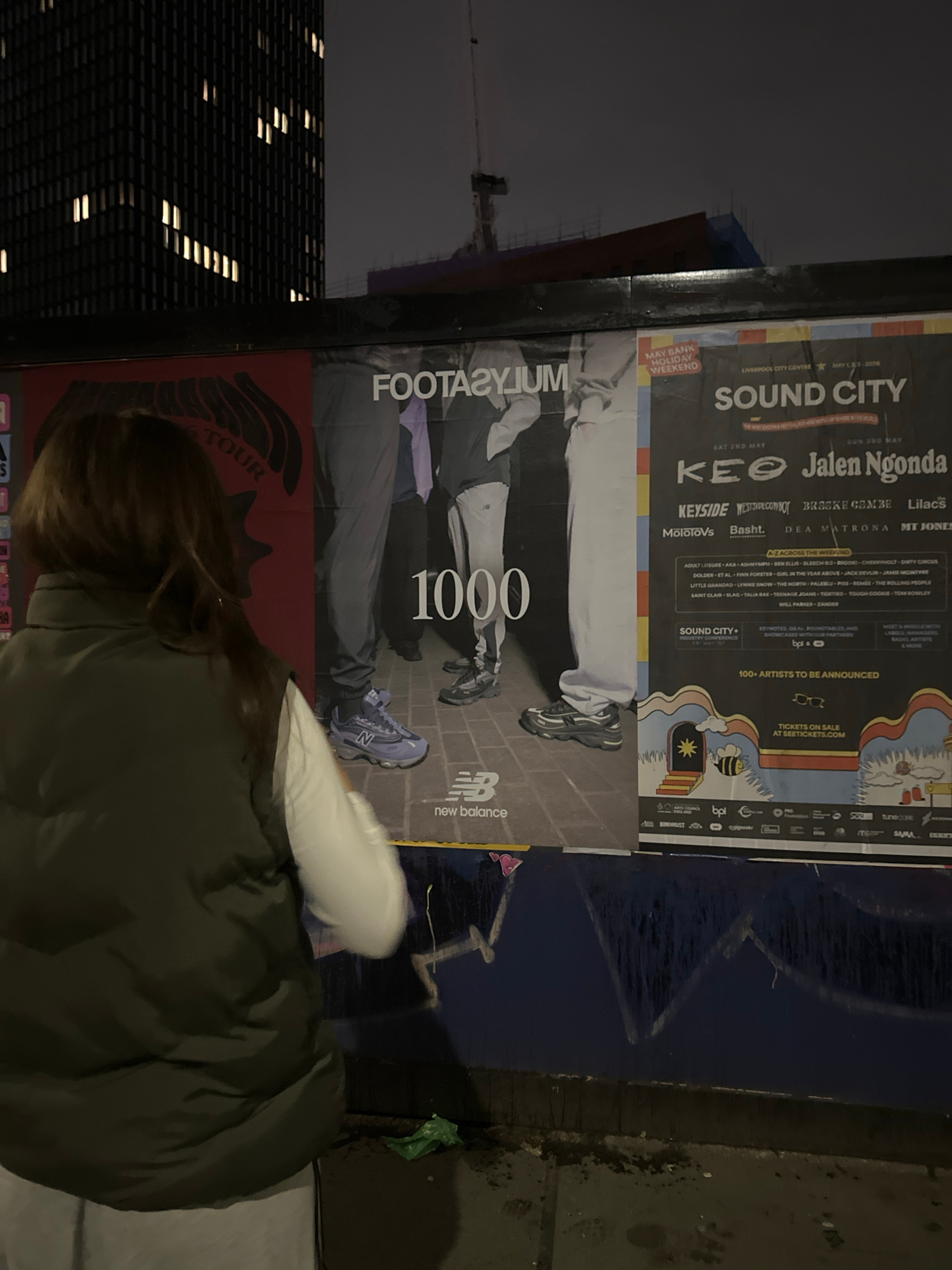 A nighttime, street-level image taken in Manchester, United Kingdom, shows a person observing a series of large promotional posters affixed to a dark blue hoarding. The individual, seen from behind,…read more