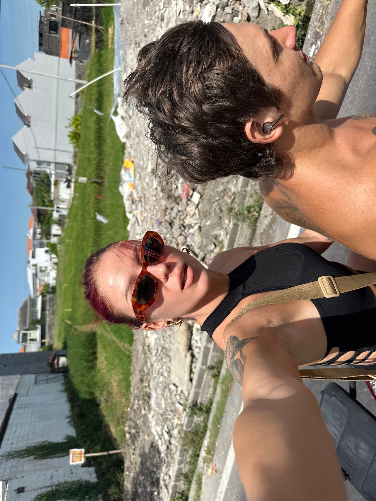 Two people are visible in the photograph, a man and a woman. The man has dark hair and is wearing an earpiece. The woman has dark hair with red streaks, sunglasses, and multiple earrings. She is weari…read more