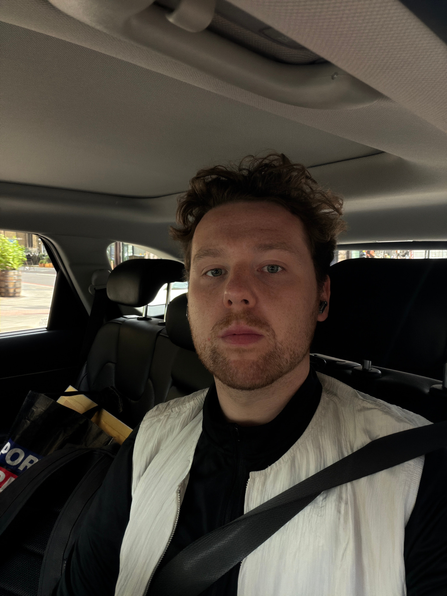 A man with curly brown hair and a light beard is in the passenger seat of a car, wearing a black shirt and a white jacket with a black seatbelt across his chest. He is looking directly at the camera.…read more