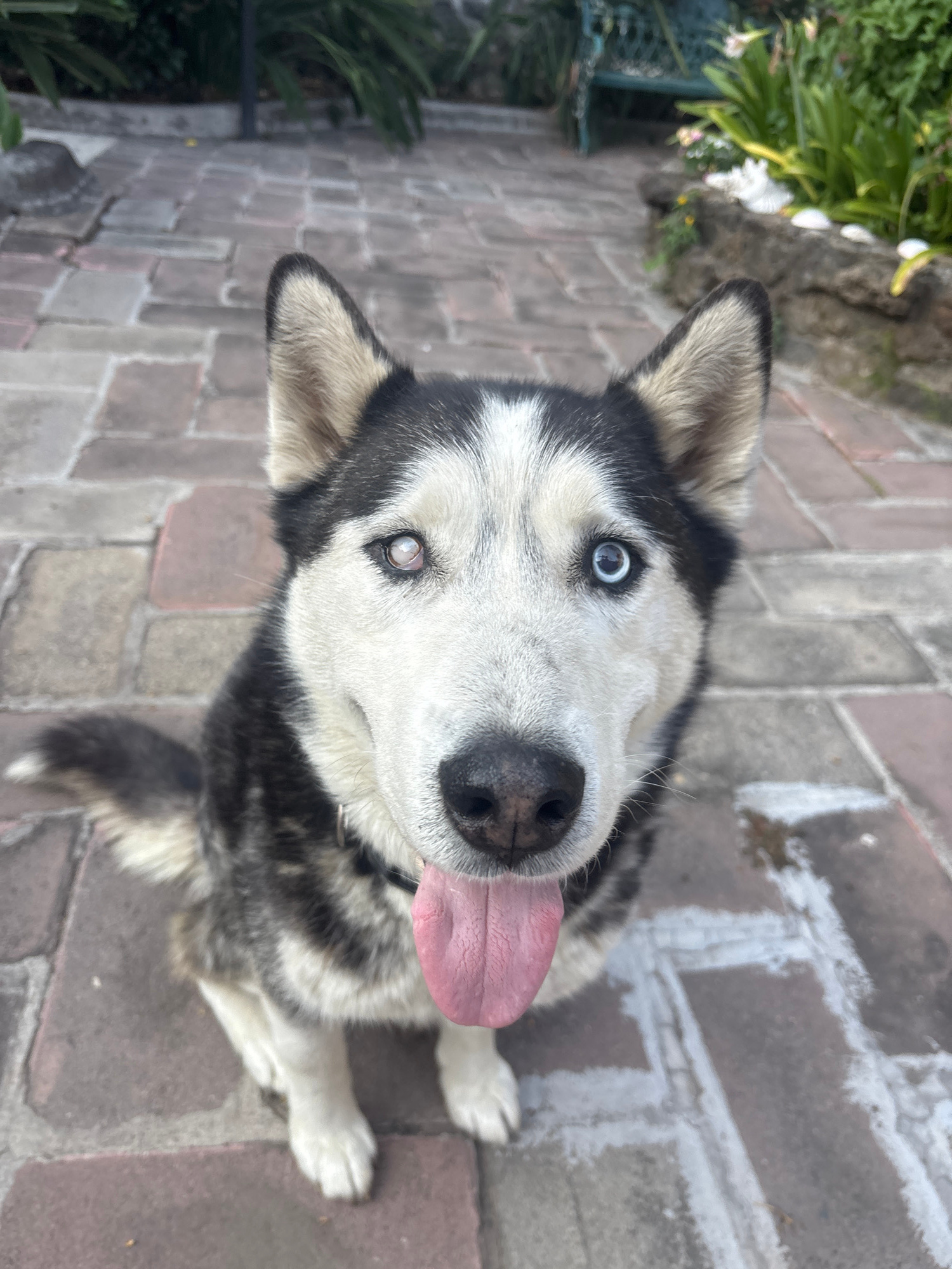 A husky dog with heterochromia (one blue eye and one eye with a white pupil) sits on a brick patio. The dog has a black and white coat and is panting with its tongue extended. Behind the dog, there's…read more