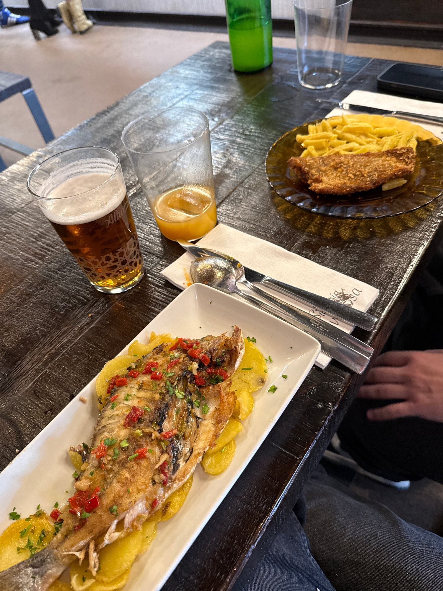 The image captures a dining scene on a dark wooden table, likely in a restaurant or bar. A plate of what appears to be breaded fish with french fries sits near the top left. In the center, there's a n…read more