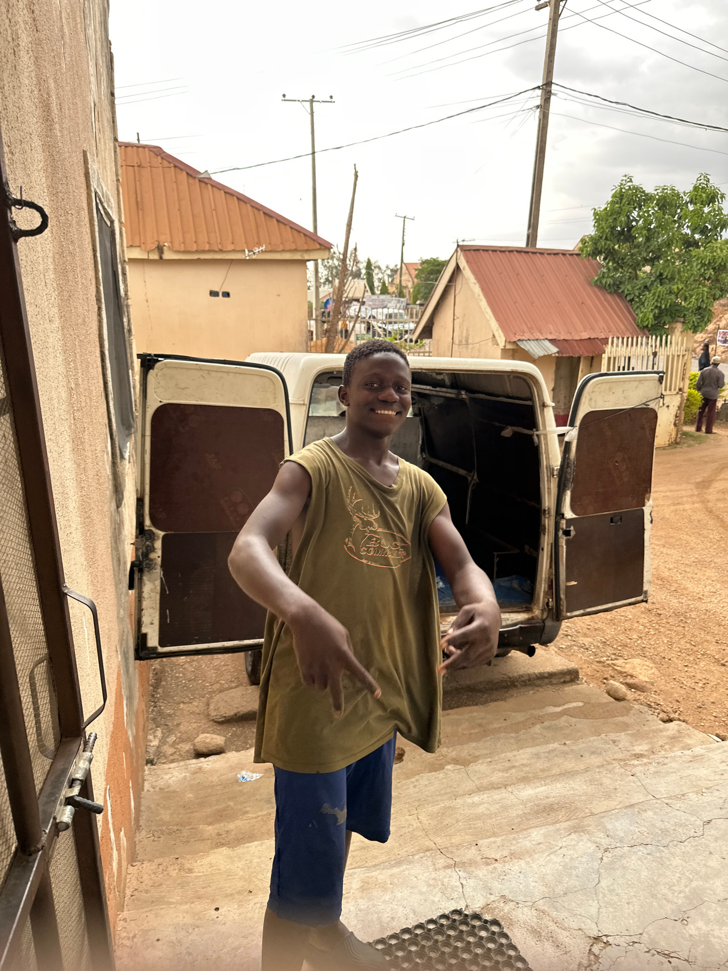 A smiling young man stands in front of a white van with open back doors on a dirt street in Jos, Nigeria. The man wears a green t-shirt and blue pants and is making a hand gesture. Buildings with brow…read more