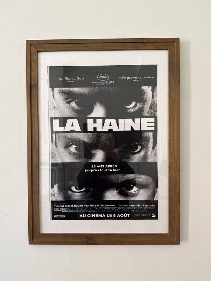 A framed movie poster for "LA HAINE" is displayed vertically on a plain white wall in an indoor setting within the city of New York, United States of America. The poster is encased in a brown wooden f…read more