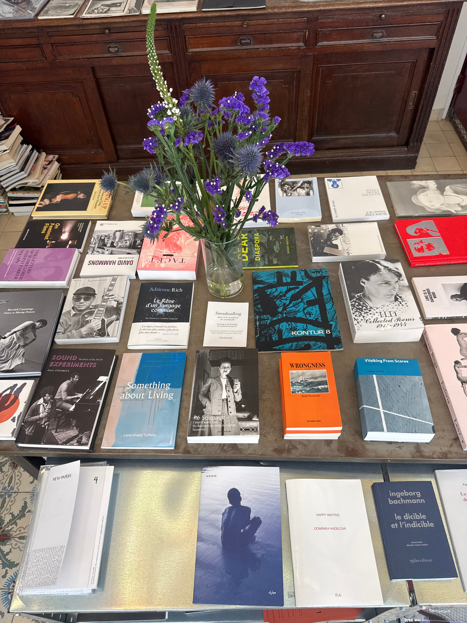 An overhead shot captures a rich display of books arranged on a table and nearby shelves, likely within a bookstore or gallery in Paris, France. A vibrant bouquet of purple thistle-like flowers and sm…read more