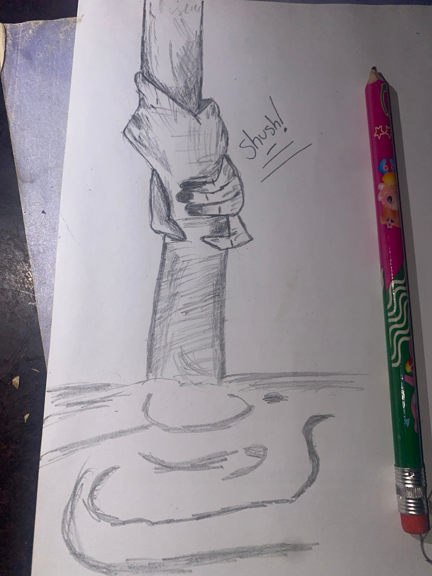 The image is a pencil drawing on white paper. The drawing depicts a hand holding a sword or large knife, seemingly poised to strike a large, amorphous shape with rounded edges. The hand is on the leftβ¦read more