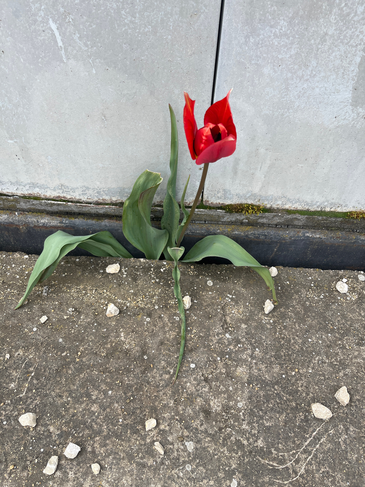 A single red tulip grows from the narrow crevice between two sections of concrete, separated by a thin metal strip. The concrete slabs are different textures; one is smooth and light gray, while the o…read more