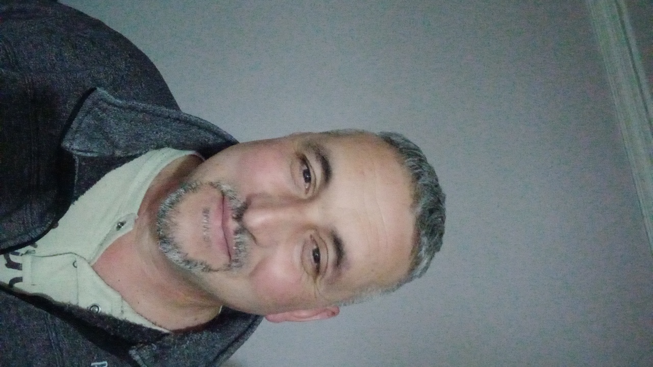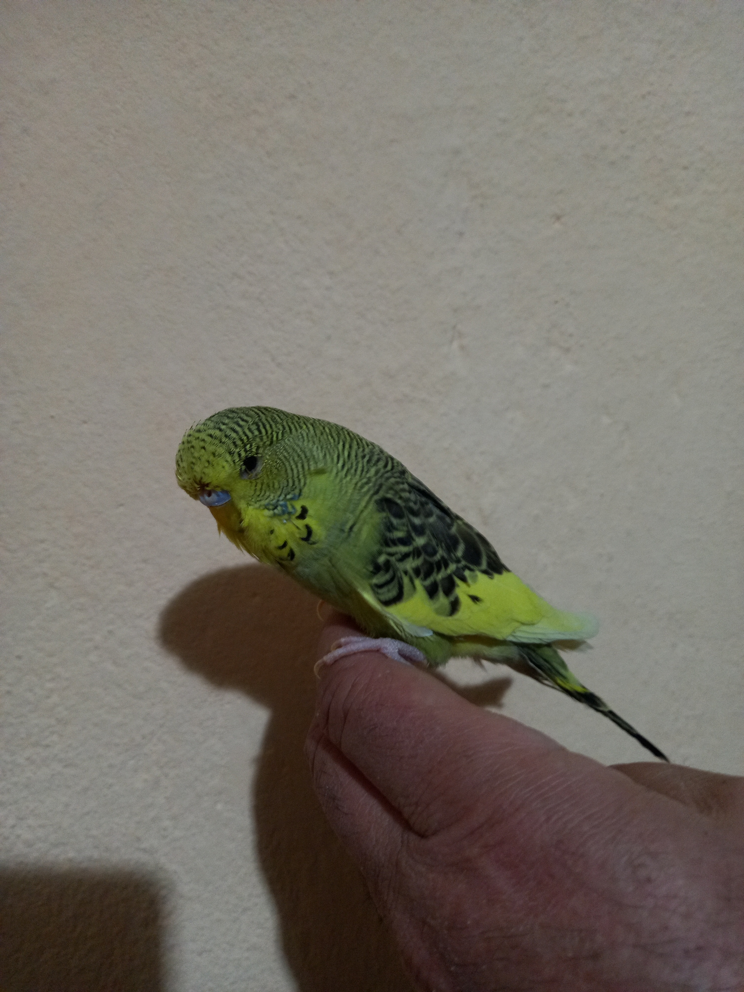 A person is holding a green and yellow parakeet. The parakeet's head is pointing downward. The background is a beige wall. The location is Asenovgrad, Bulgaria.