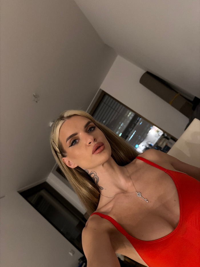 A woman with blonde hair and bold eyeliner poses in a red top. She has a delicate silver necklace with a key pendant and a tattoo on her neck. The background shows a dimly lit room with a window overl…read more