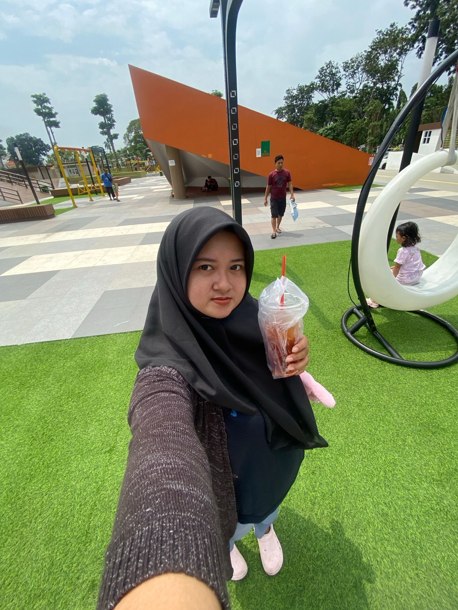 The image captures a public recreational park in Sidoarjo, Indonesia, under a bright, partly cloudy sky. In the immediate foreground, a female individual, wearing a black hijab, dark blue top, dark gr…read more
