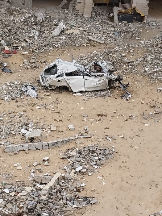 The image depicts a scene of extensive destruction in Khan Yunis, Palestinian Territory. Centrally positioned is a severely damaged white four-door sedan, its roof caved in, body panels extensively cr…read more