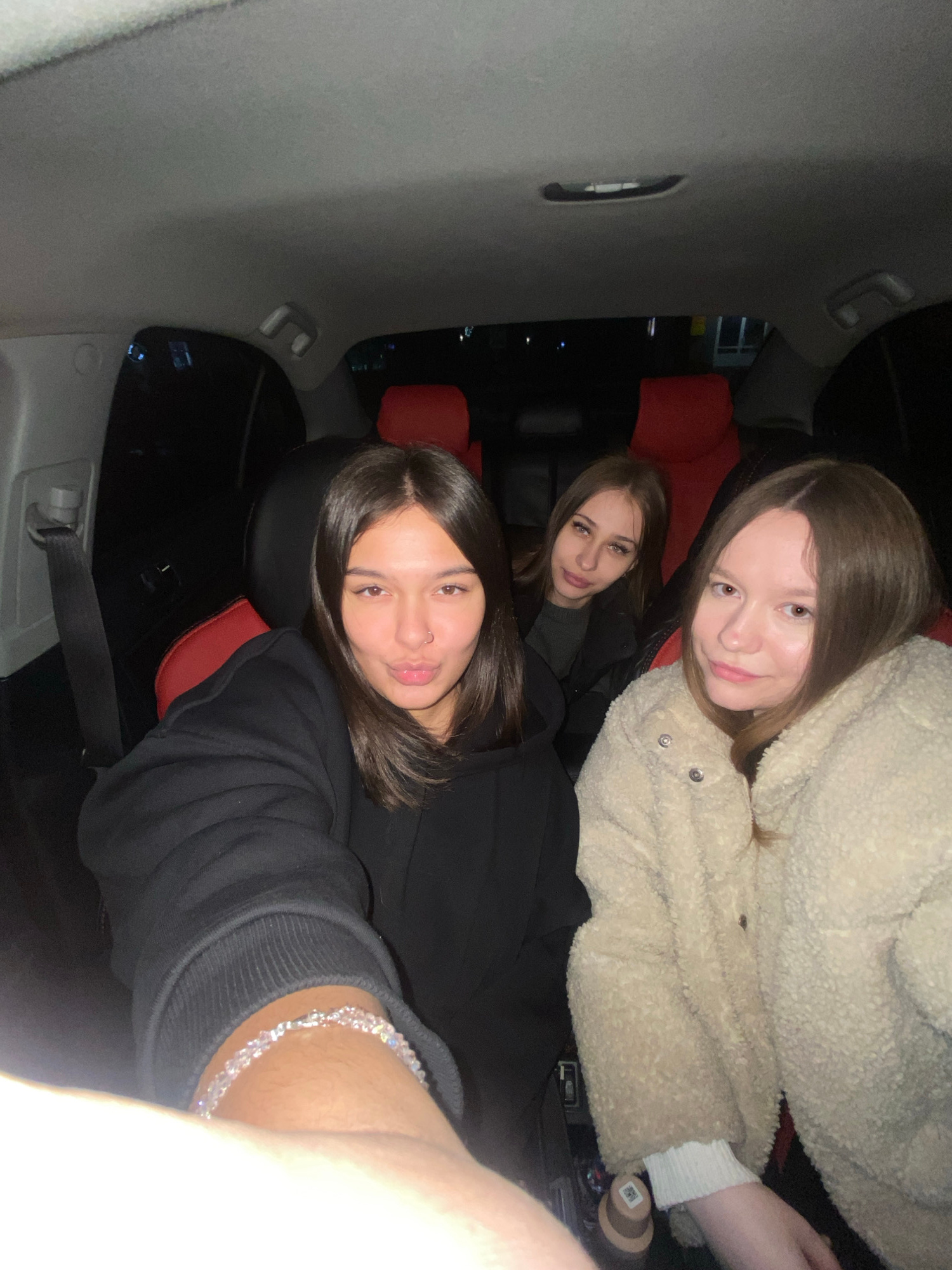 Three young women are inside a vehicle, possibly a car, likely taking a selfie. The interior of the vehicle is dark with red seats. The woman in the foreground is wearing a black hooded sweater and a…read more