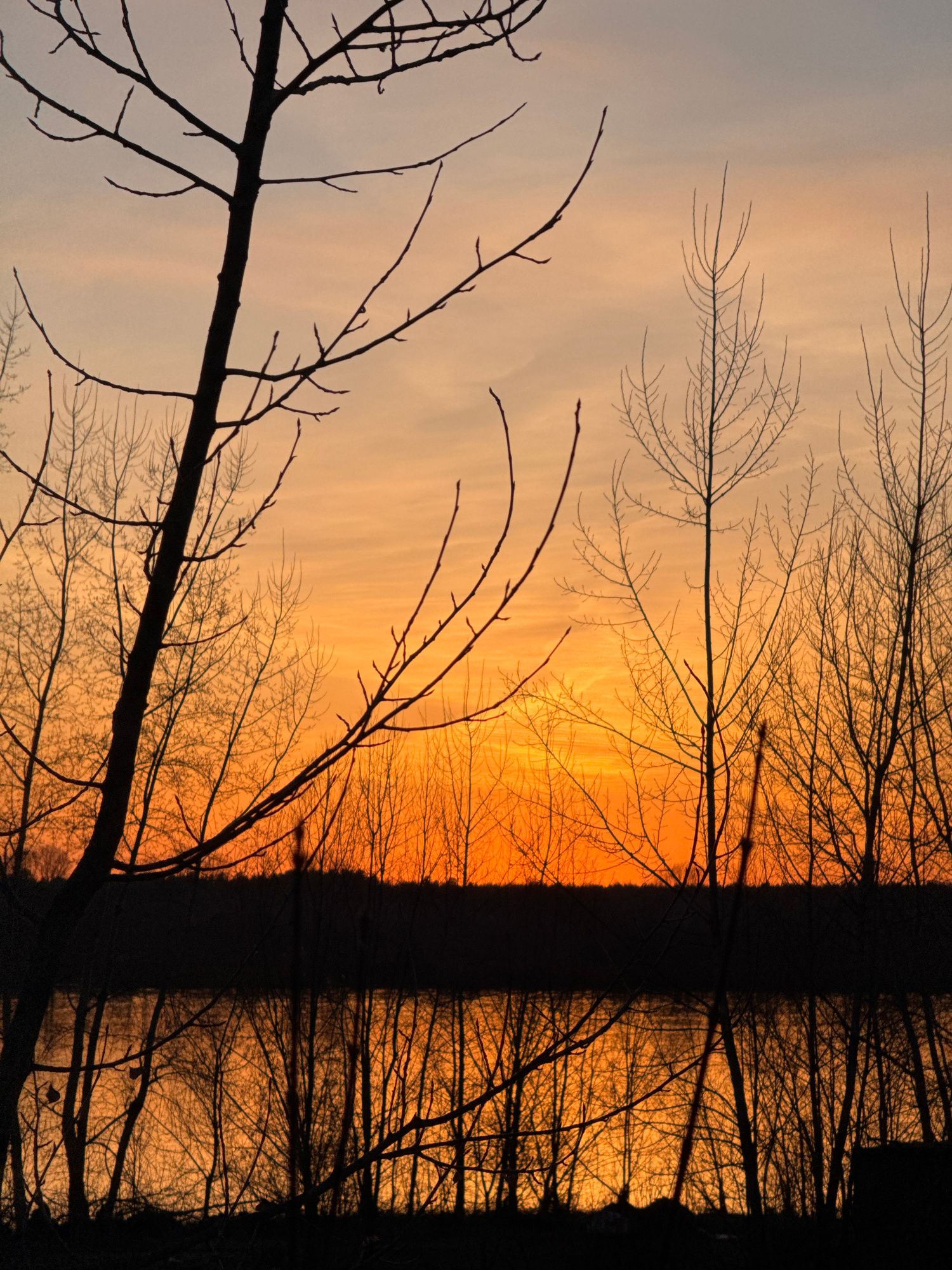 A landscape photograph depicts a dramatic sunset or sunrise over a natural area, showcasing the stark silhouettes of bare trees against a vibrant sky. The sky presents a striking gradient of warm huesβ¦read more