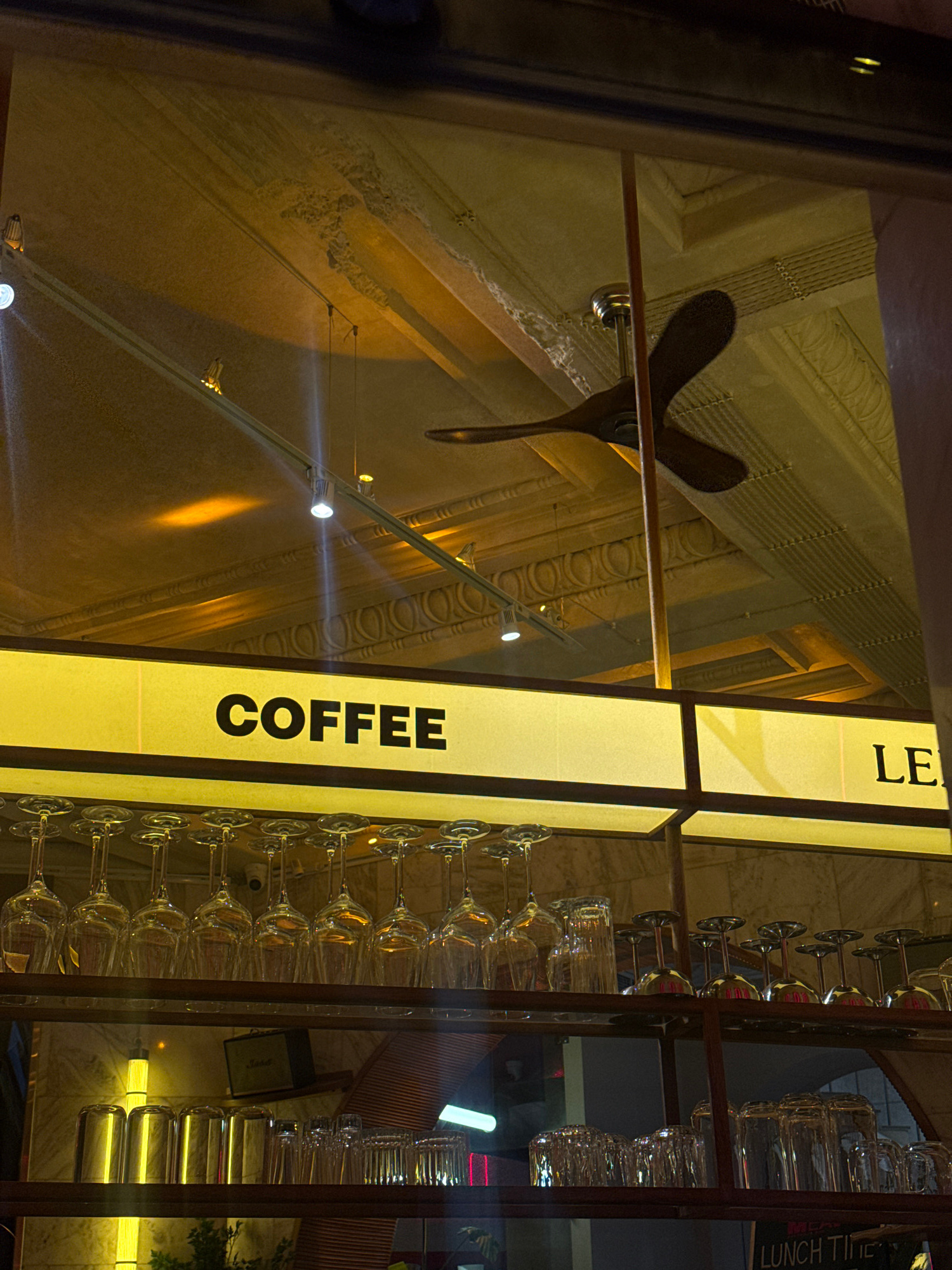 The image depicts an interior view of Coffee LE Street Bar, located at 2 Abovyan Street, Yerevan, Armenia. The perspective is looking upwards and across a service area, possibly from a patron's viewpo…read more