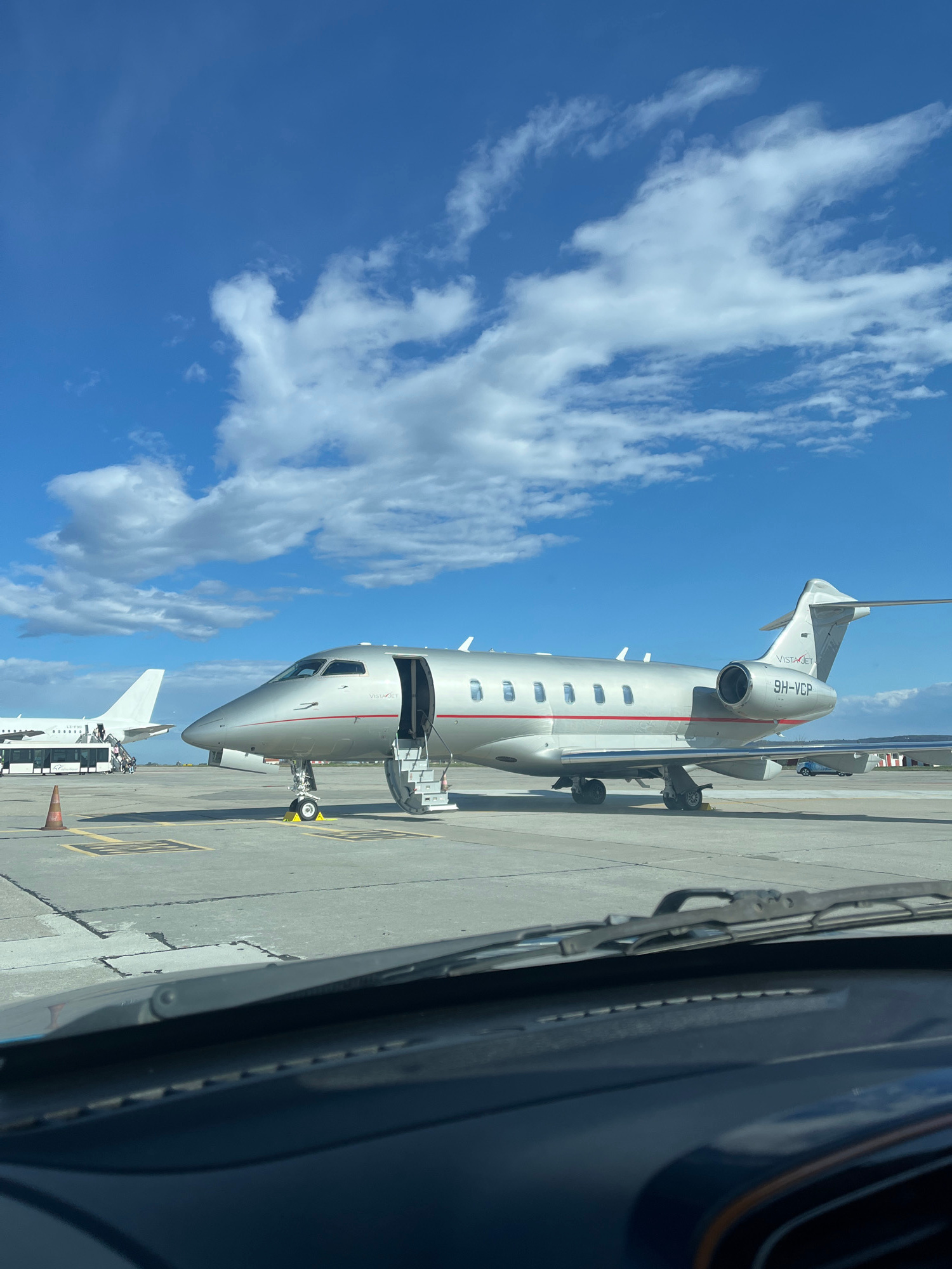 A private jet, registration 9H-VCP, is parked on the tarmac at Varna Airport in Varna, Bulgaria. The jet is silver with a red stripe and has its boarding stairs extended. The day is sunny with scatter…read more
